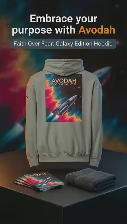 Step into a world of bold self-expression with the Faith Over Fear: Avodah Galaxy Edition Hoodie. Crafted for those who push boundaries and move with purpose, this piece is more than just an addition to your wardrobe—it’s a cosmic statement. Featuring a powerful "FAITH" graphic on the front and the iconic Avodah spaceship against a breathtaking galactic background on the back, this hoodie is an emblem for anyone who dreams big and moves with courage.